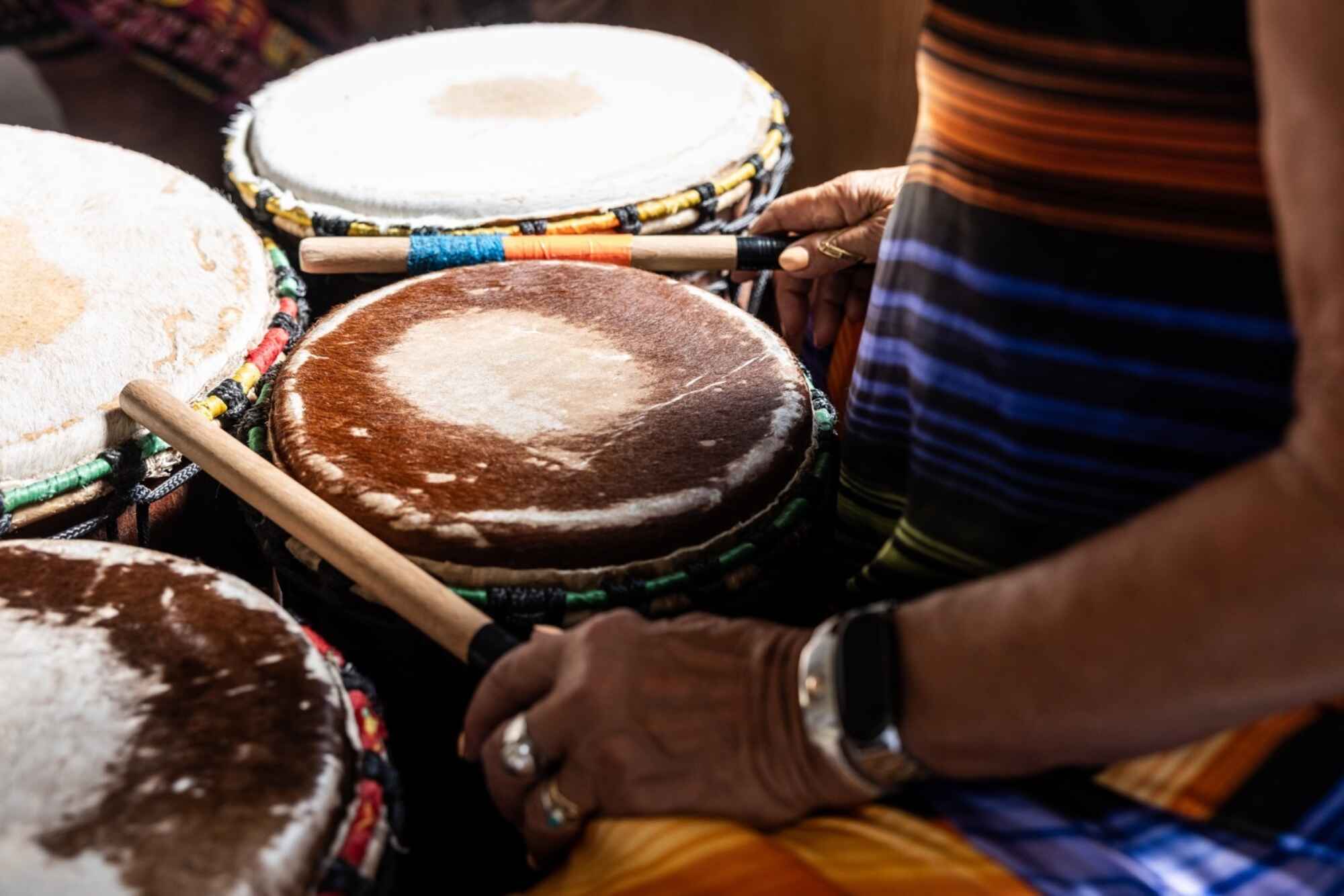 In Gruppen wird traditionelle westafrikanische Musik gemacht. Es wird auf 4 Basstrommeln gespielt.