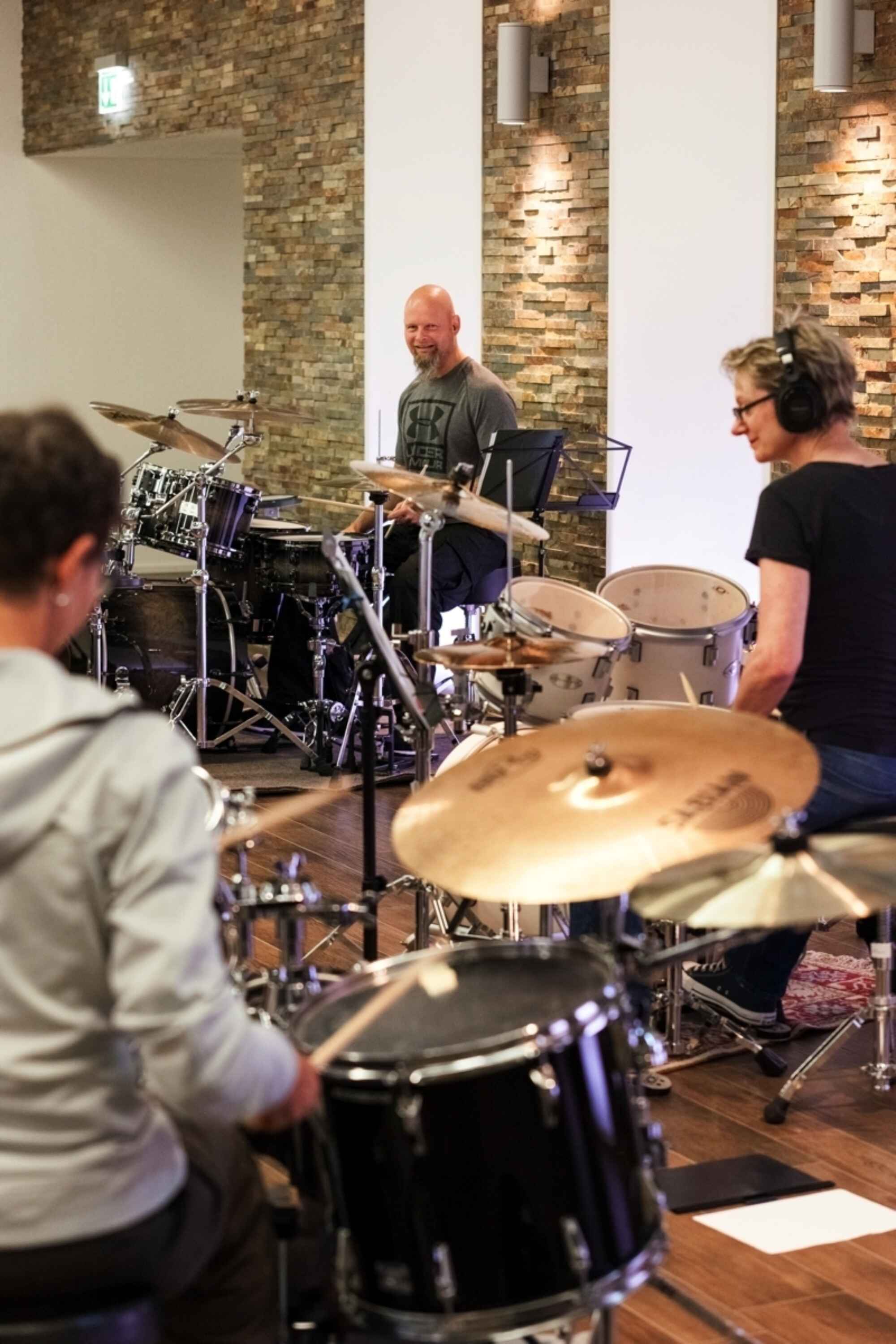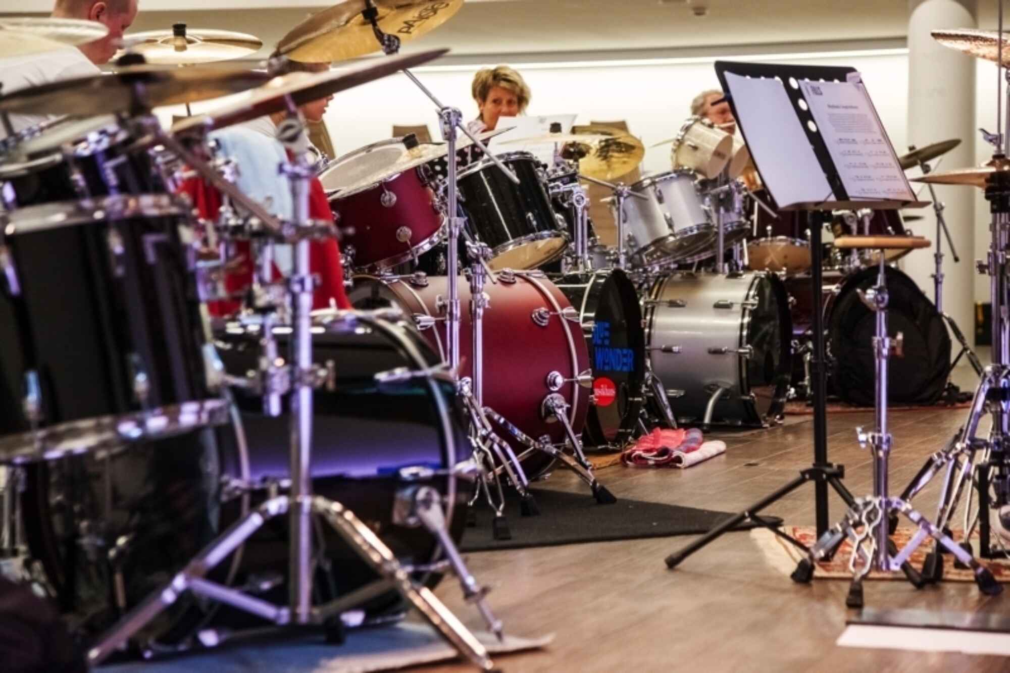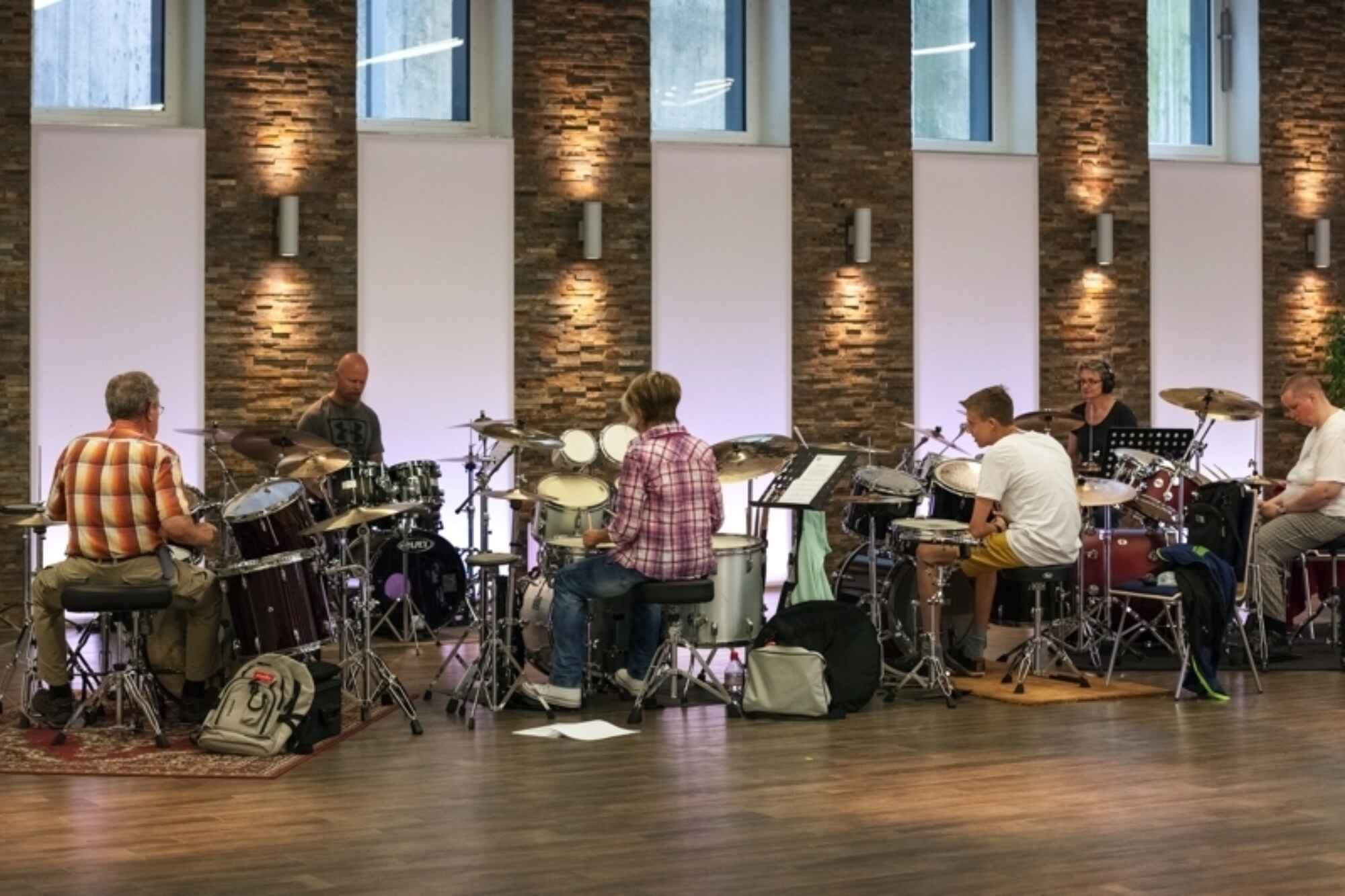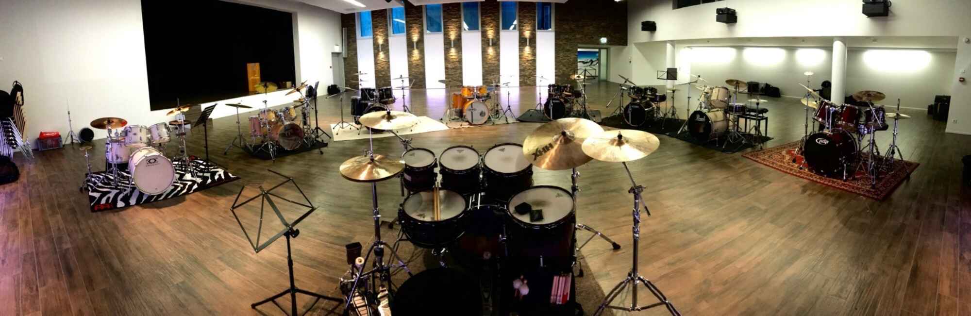Wir sind in einem wunderbaren Konzertsaal mit sehr guter Akustik und viel Platz, wo wir alle unsere Instrumente aufbauen können. Wir drummen miteinander und manchmal auch alleine.
