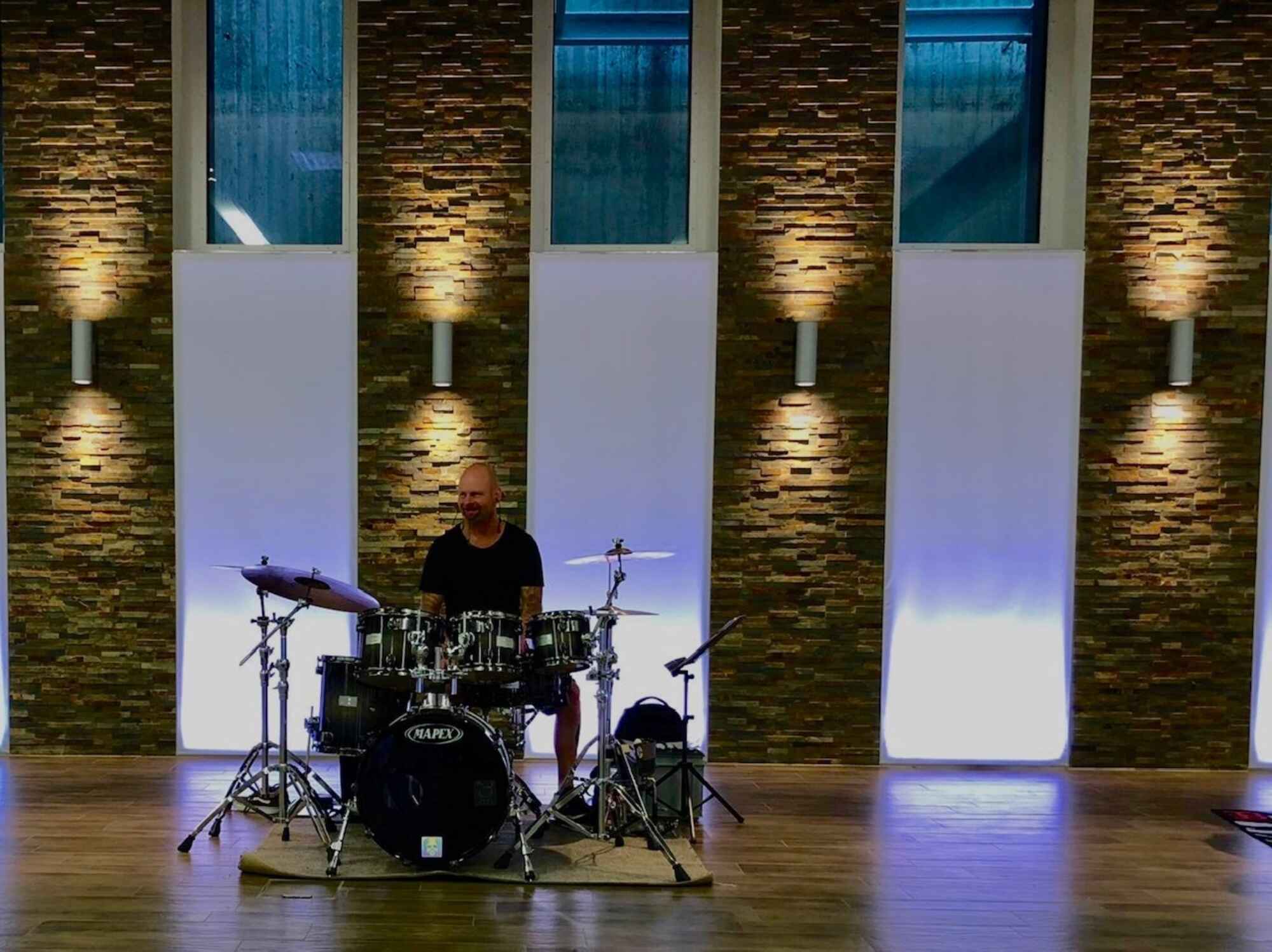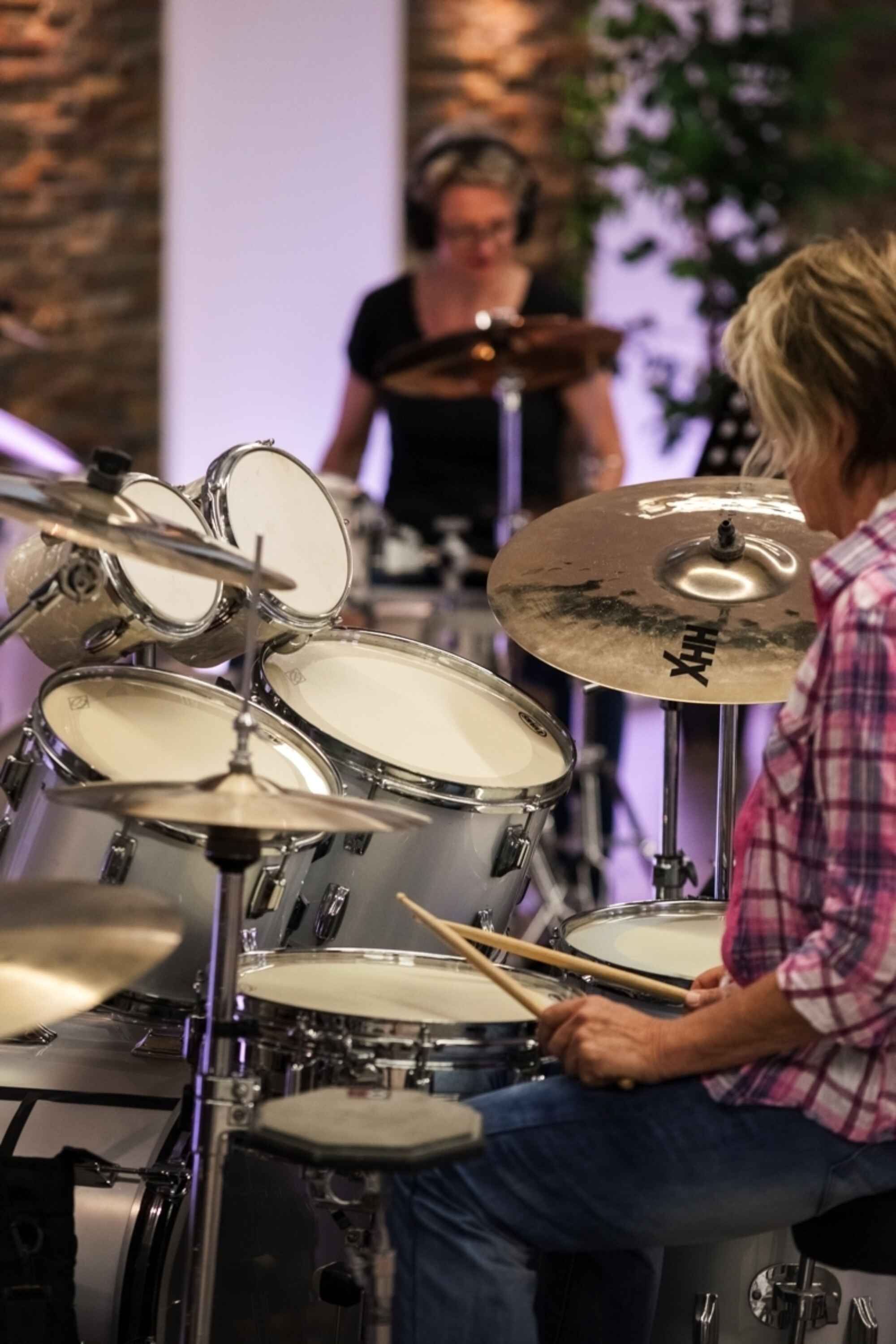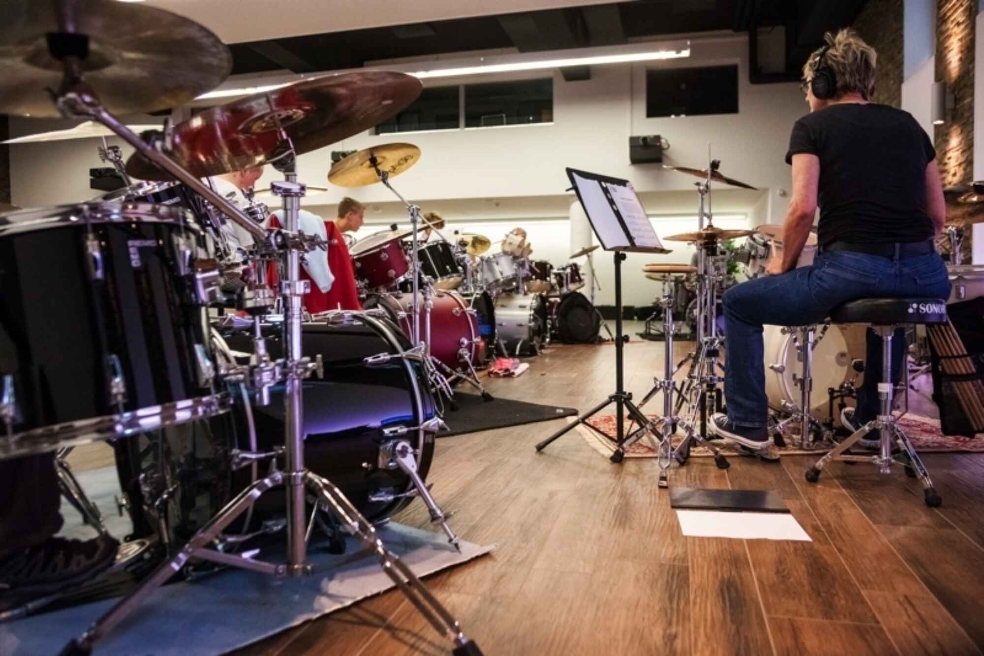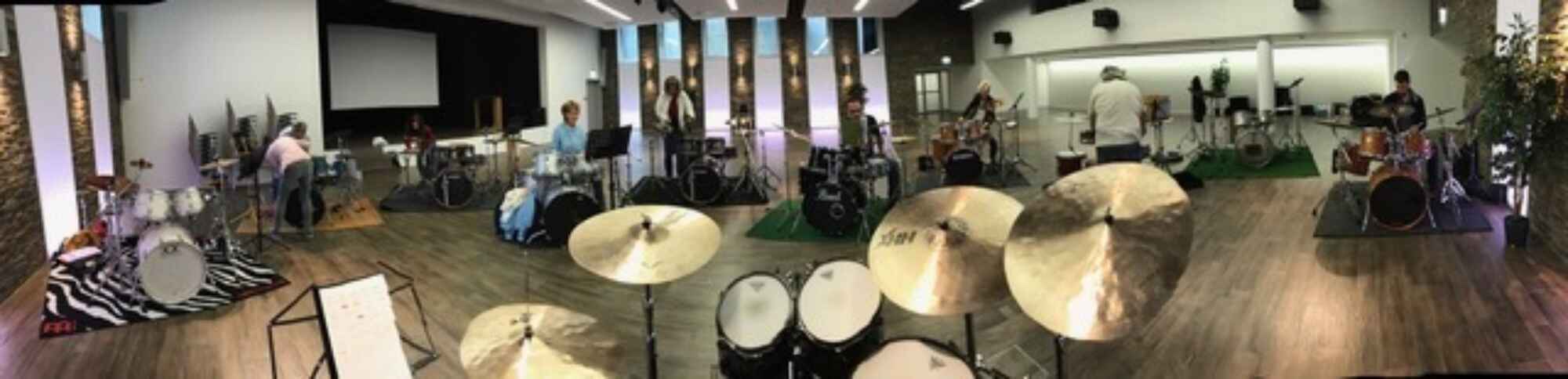 Wir sind in einem wunderbaren Konzertsaal mit sehr guter Akustik und viel Platz, wo wir alle unsere Instrumente aufbauen können. Wir drummen miteinander und manchmal auch alleine.